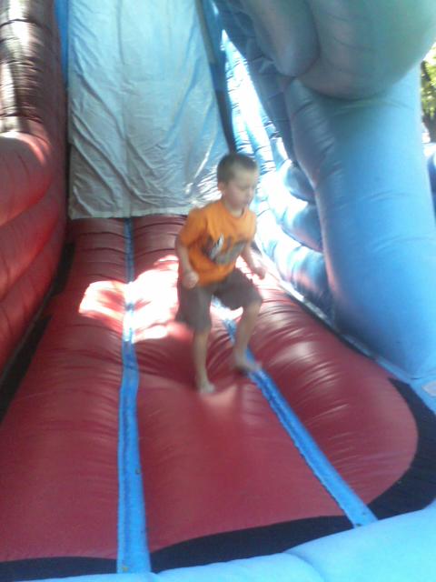 For the past couple of years, we have taken PJ to the Days of 47 Children's Parade. It works out well because the start of the parade is outside of the building where I work. This year we were late so we headed directly to the fair which is held at Washington Square. PJ had a blast because he had the inflatable slides and jump houses almost to himself. He also got a spiderman eye.